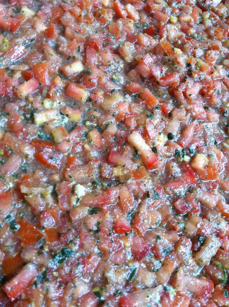 sliced tomato, fresh basil leaves, olive oil, mozzarella & pesto sauce.